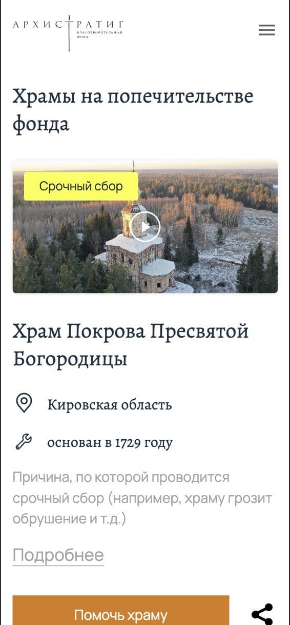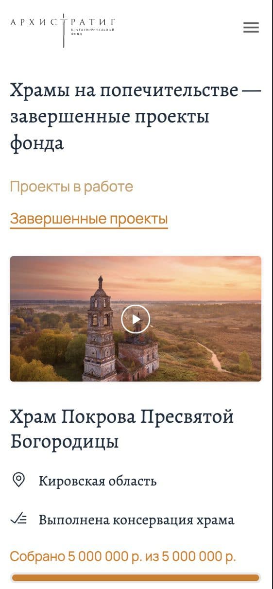 Реализован каталог проектов с актуальным списком храмов, требующих восстановления, и отдельным разделом завершённых проектов.