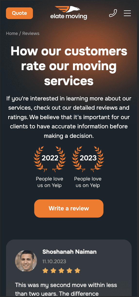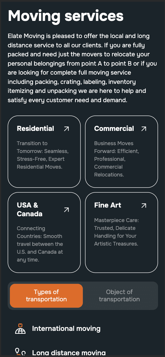 Компании Elate Moving понадобился редизайн и продвижение сайта в позициях. С моей стороны заказ на разработку сайта на платформе WordPress.