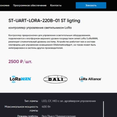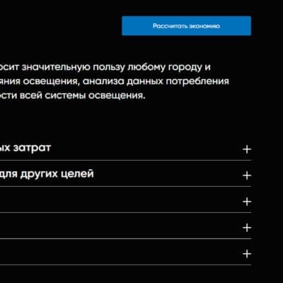 Компания пришла с уже готовым дизайном, задача заключалась в верстке и установки на CMS WP. Это был корпоративный сайт, из особенностей — сложнейший калькулятор, который подсчитывает годовую экономию при использовании светильников компании. Сложность заключалась, в вычислении координат городов с последующим вычислением времени захода/восхода солнца. Далее идет подсчет режимов освещения в суточном эквиваленте, все это выводится на интерактивные графики и происходит расчет экономии.